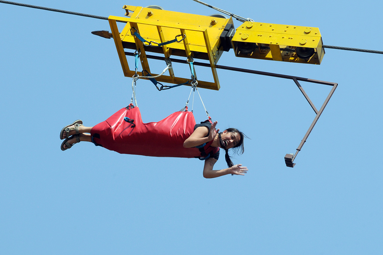 • To be freed by gravity, get harnessed to the wire. Roll down the wire to a height of up to 7 metres above the river's surface, take off again, and land at the lowest point. A retrieval mechanism will draw you back to the launch pad.